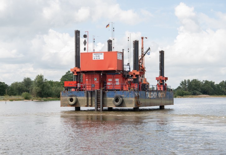 Wer zur Hubinsel „TK14“ möchte, startet in der Regel an der Anlegestelle des Bremer Boots- und Schiffsservices. Das Wasser plätschert am Rumpf, Elmar steht bereits am Ruder von Jörn, seinem kleinen Schlepper auf der Weser. Im Juli steuert er beinah täglich auf die Plattform zu, die Anfang des Monats für die Baugrunduntersuchungen von Korridor B von Hamburg mit einem Hochsee-Schlepper über die Nordsee in die Nähe des Elsflether Sands gebracht wurde.