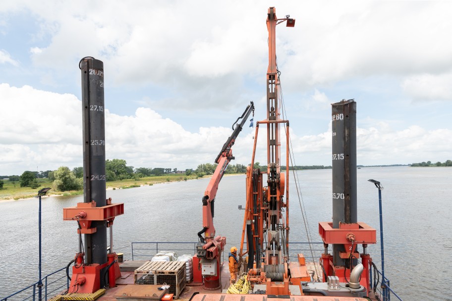 Ist alles am vorgesehenen Platz, braucht es für die eigentlichen Arbeiten zunächst die Kampfmittelfreiheit. Gibt das „Muni“-Team – so werden die Experten für Kampfmittelsondierungen vor Ort genannt – grünes Licht, startet der Bautrupp den Bohrer. Ziel ist es, Bodenproben unterhalb des Wassers zu entnehmen und auf diese Weise Kenntnisse über die Beschaffenheit sowie Tragfähigkeit des Baugrunds zu gewinnen.