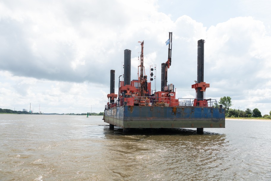 Bereits seit Mitte 2024 laufen für Korridor B Baugrunduntersuchungen (BGU), bisher vor allem an Land. Nun finden diese Beprobungen des Untergrundes auch unter der Wasser statt. Ein Blick auf die Bohrinsel auf der Weser.
