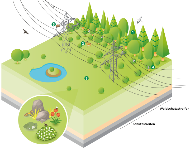 Durch das ökologische Trassenmanagement schafft Amprion neue Lebensräume auf den Trassen. Diese sind entlang unseres weitverzweigten Übertragungsnetzes miteinander verbunden. So entsteht ein vernetzter Biotopverbund, der die Inselbildung von Arten vermeidet und ihre Entwicklung fördert. Artenschutz bedeutet für uns auch, Tiere während des Betriebs unserer Freileitungen zu schützen.