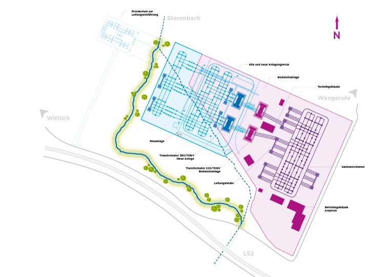 Im rheinland-pfälzischen Wittlich erweitert und modernisiert Amprion die bestehende 110-/220-Kilovolt-Umspannanlage Wengerohr. Dadurch erhöhen wir die Spannungsebene der Anlage auf 380 Kilovolt (kV). Über die Freileitung zwischen Metternich und Niederstedem, die wir ebenfalls ausbauen, werden wir die Anlage in das 380-kV-Übertragungsnetz einbinden. So machen wir die Umspannanlage, die aus den 1960er Jahren stammt, fit für die Energiewende.