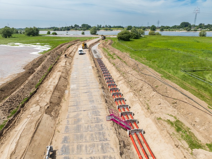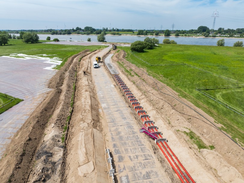 Die Baumaßnahmen für die gesamte Rhein-Querung sind für den Zeitraum von April bis Oktober angesetzt. Auch beide Deiche müssen bis Ende Oktober wieder renaturiert sein. Dementsprechend laufen die Arbeiten vor Ort derzeit auf Hochtouren. Aktuell wird im Rhein-Vorland auf der Reeser Seite der Kabelgraben hergestellt und der Wiederaufbau des Deiches vorbereitet. Auf der Xantener Seite wird derzeit der Deich abgetragen, um auch dort mit der offenen Bauweise starten zu können.