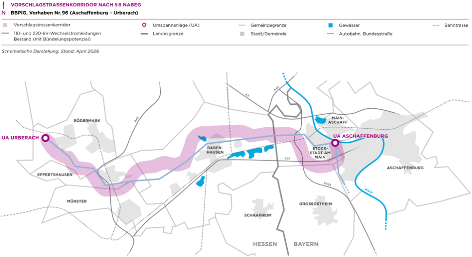 Als zuständiger Übertragungsnetzbetreiber plant Amprion den Neubau einer 380-Kilovolt-Freileitung zwischen Urberach in Hessen und Aschaffenburg in Bayern. Die rund 23 Kilometer lange Leitung mit zwei Stromkreisen soll bis 2035 in Betrieb gehen. Verfahrensführende Behörde ist die Bundesnetzagentur (BNetzA) in Bonn.