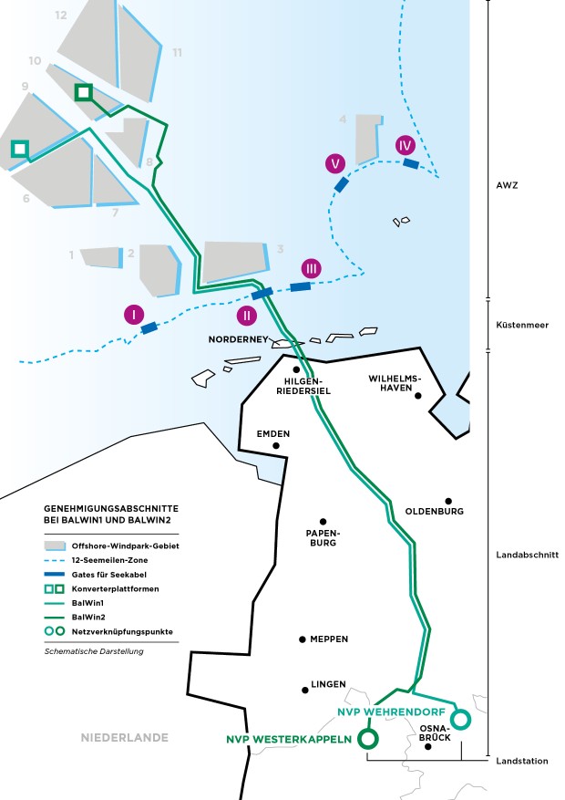 Die öffentlich-rechtliche Genehmigung der beiden Offshore-Systeme erfolgte über ein Planfeststellungsverfahren, das im Juni 2025 abgeschlossen werden konnte. Der Planfeststellungsbeschluss kommt dabei einer Baugenehmigung gleich. Mit dem feierlichen Spatenstich auf Norderney starteten rund einen Monat später die Baumaßnahmen im Abschnitt Küstenmeer.