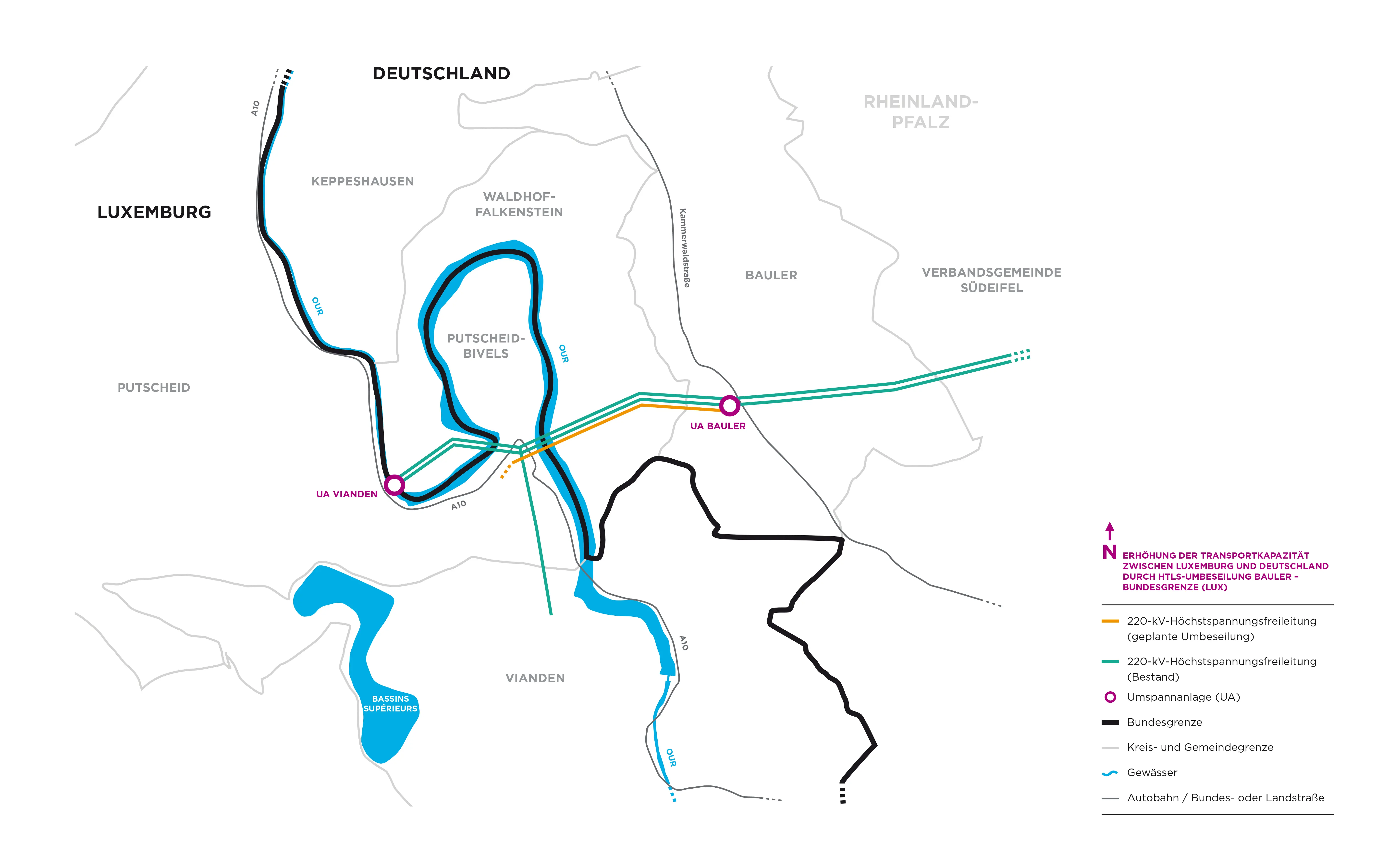 Das angestrebte Genehmigungsverfahren bei der Struktur- und Genehmigungsdirektion Nord für die geplante Auflage von Hochtemperaturleiterseilen auf der Freileitung zwischen der Umspannanlage Bauler in der Verbandsgemeinde Südeifel bis zur Bundesgrenze nach Luxemburg wird daher nicht fortgeführt. Die bisher erworbenen Kenntnisse aus den Unterlagen fließen vollständig in die Umsetzung der anstehenden Maßnahmen mit ein. Aktuell konkretisieren wir die Planungen für den Seiltausch sowie den Austausch der Isolatoren, an denen die Leiterseile befestigt sind. Der Umsetzungszeitraum hängt dabei von verschiedenen Rahmenbedingungen ab. So muss ein Zeitfenster gefunden werden, in dem die Leitungen freigeschaltet und sicher an ihnen gearbeitet werden kann. Da die Auslastung in Grenzregionen besonders hoch ist, ist eine Freischaltung nur mit exakter Planung und unter Berücksichtigung aller Netzabhängigkeiten möglich.