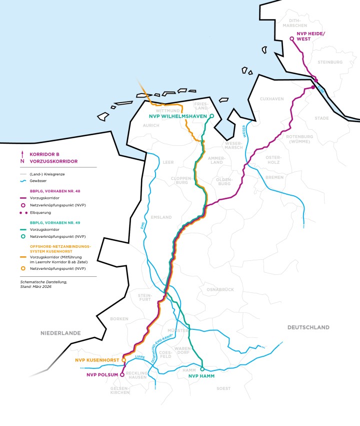 31.03.2026 – Ein bisher im Korridor Windader West geplantes Offshore-Netzanbindungssystem (ONAS) mit Netzverknüpfungspunkt an der Umspannanlage Kusenhorst wird größtenteils in den bereits geplanten Leerrohren von Korridor B realisiert. Das ONAS nutzt Vorarbeiten und Trassenplanung aus dem Projekt Korridor B.