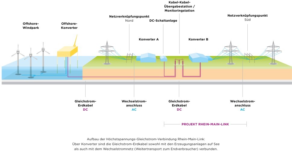 Gemeinsamer Startpunkt des Rhein-Main-Links ist der sogenannte NordWestHub in Ovelgönne-Großenmeer (Landkreis Wesermarsch, Niedersachsen). Hier werden die beiden Gleichstromverbindungen, die aus der Nordsee kommen, mit den landseitigen Gleichstromverbindungen gebündelt. Für die Standortsuche sowie die Realisierung des Hubs ist der Übertragungsnetzbetreiber TenneT verantwortlich. Amprion beteiligt sich an der Planung der Anlage.