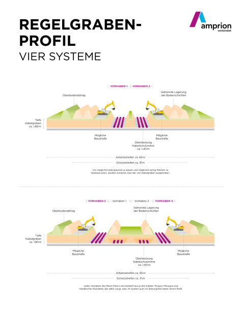 Nach Möglichkeit verlegt Amprion die Erdkabel standardmäßig in der offenen Bauweise. Diese bietet den größten Gestaltungsspielraum, um flexibel auf die örtlichen Anforderungen eingehen zu können. Die offene Bauweise ermöglicht zudem, die Flächeninanspruchnahmen sowie die Betroffenheit Dritter deutlich zu reduzieren. Zudem ist sie zeit- und kosteneffizienter und damit meist die wirtschaftlichste Lösung. Bei der offenen Bauweise öffnen wir für jedes Vorhaben je einen Graben. Die Gräben haben eine Tiefe von 1,80 Meter und die Kabel liegen in der offenen Bauweise ca.1,40 Meter bis 1,60 Meter tief.