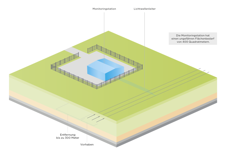 Der Flächenbedarf für eine Monitoringstation beträgt circa 400m². Dieser ergibt sich aus der Grundfläche des Betriebsgebäudes sowie einer befestigten Parkplatzfläche, die für Wartungs- und Instandhaltungszwecke vom Betriebspersonal genutzt werden kann