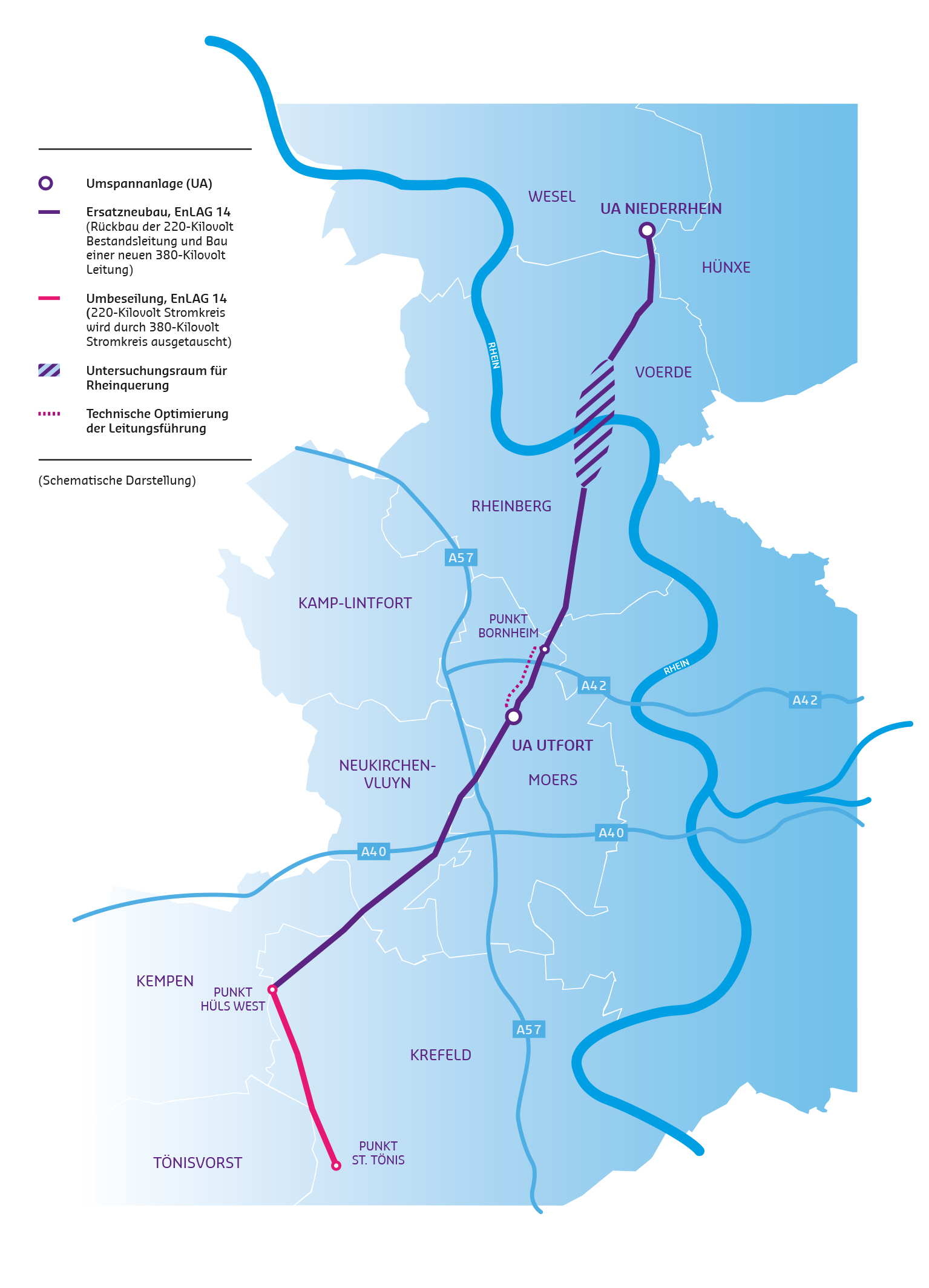 Das Planfeststellungsverfahren betrifft die seit 1926 betriebene 220-Kilovolt (kV)-Freileitung zwischen Wesel und Krefeld-Hüls. Sie soll im Abschnitt zwischen der Umspannanlage (UA) Wesel/Niederrhein (Stadt Wesel) und der UA Utfort (Stadt Moers) durch eine neue Höchstspannungsleitung ersetzt werden, die Energie auf der Spannungsebene 380-kV transportieren kann. Zusätzlich wird auf diesem Abschnitt die 110-kV-Leitung mitgeführt. Im weiteren Verlauf ist zwischen der UA Utfort und dem sogenannten Punkt Hüls-West (Stadt Krefeld) auf 15 Kilometern der Neubau einer 380-kV-Leitung im Trassenraum der vorhandenen 220-kV-Freileitungstrasse geplant. Die bisherige 220-kV-Leitung kann somit entfallen.