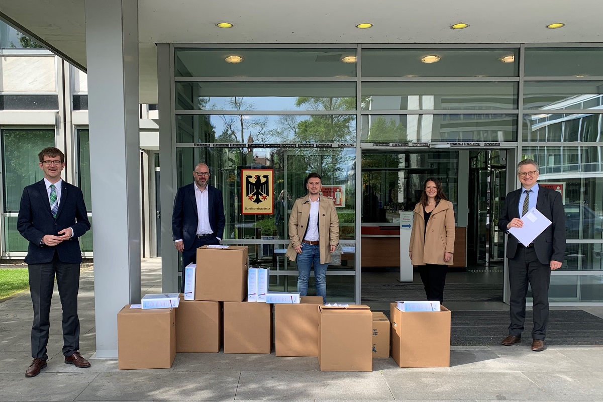 Die Amprion-Mitarbeiter Carsten Stiens (2.v.li.), Lucas Kaufmann (Mitte) und Verena Kreggenwinkel (2.v.re.) übergaben die Antragsunterlagen am 30. April an Dr. Bodo Herrmann (re.) und Benedikt Stratmann (li.) von der Bundesnetzagentur.