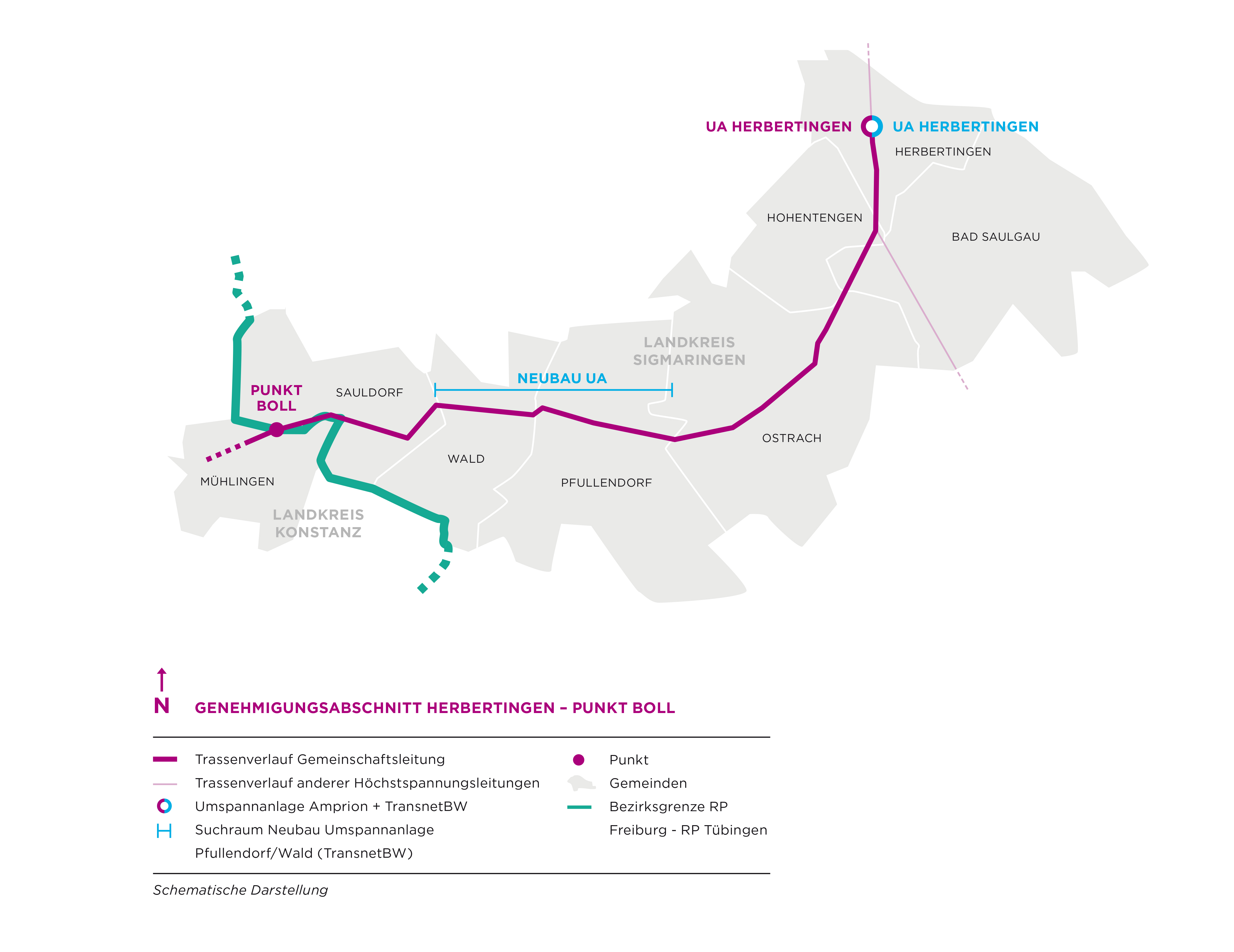 Amprion übernimmt das Planungs- und Genehmigungsverfahren im Zuständigkeitsbereich des Regierungspräsidiums Tübingen und verantwortet den Ersatzneubau des Abschnitts von der Umspannanlage Herbertingen bis zum Punkt Boll in Sauldorf. Der 40 Kilometer lange Abschnitt verläuft durch sieben Gemeinden im Landkreis Sigmaringen.
