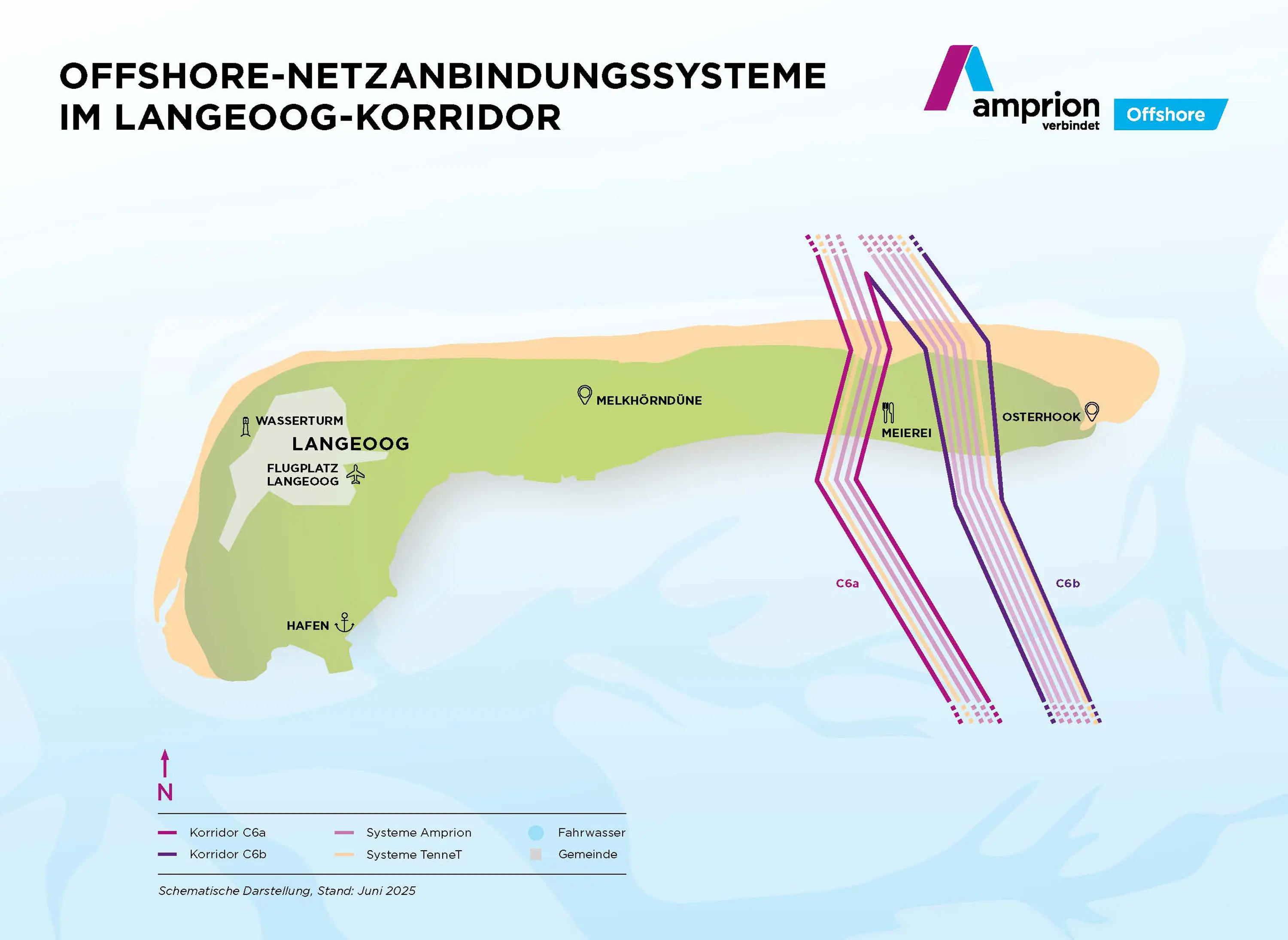Als Übertragungsnetzbetreiber haben Amprion und TenneT die Aufgabe, das Stromnetz fit für eine klimaneutrale Zukunft zu machen. Der Insel Langeoog kommt hierbei eine besondere Bedeutung zu, da einige Netzanbindungssysteme auf ihrem Weg von den Offshore-Windparks in der Nordsee bis in die Verbrauchszentren von Nordrhein-Westfalen, Niedersachsen und Hessen die Insel im ”Langeoog-Korridor” unterqueren. Im Bereich von Langeoog werden Amprion und TenneT insgesamt bis zu acht Offshore-Netzanbindungssysteme mit jeweils 2 Gigawatt Leistung installieren. Das entspricht in Summe etwa dem Bedarf von 16 Millionen Menschen. Die Inbetriebnahme ist nach aktuellem Stand in den 2030er Jahren geplant.