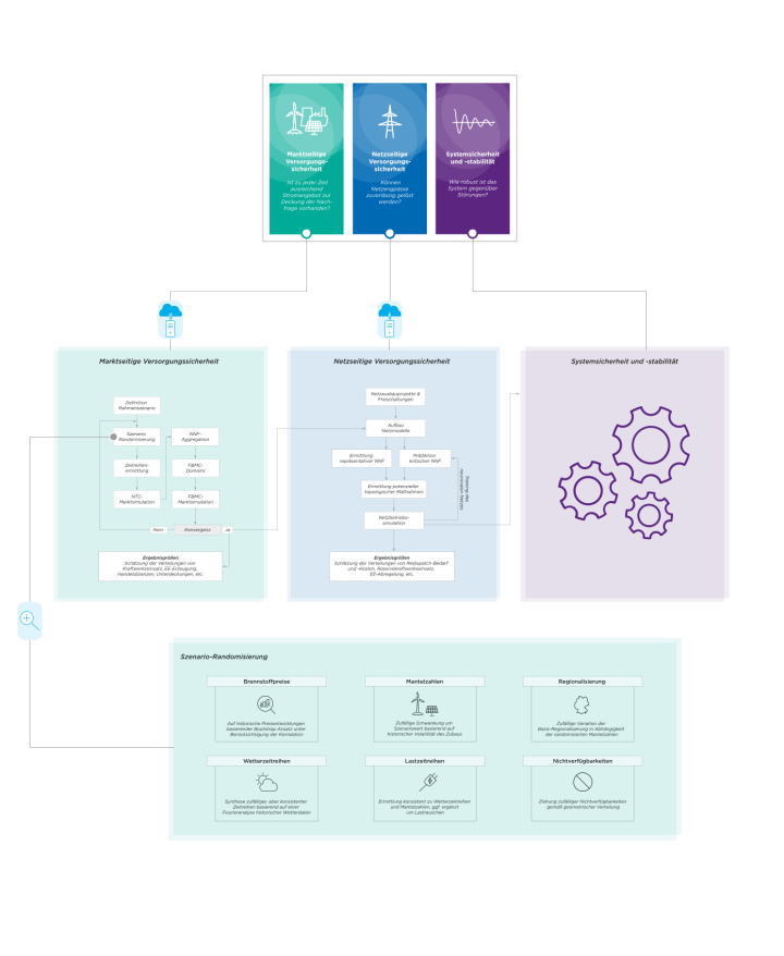 Das Ablaufdiagramm zeigt, wie die unterschiedlichen Dimensionen der Versorgungssicherheit analysiert werden und wie die Analysen aufeinander aufbauen.