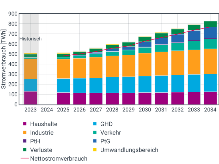 Die Stromnachfrage ist geprägt durch neue Verbraucher, die im Zuge der Elektrifizierung in den Sektoren Industrie, Wärme und Verkehr sowie der Digitalisierung langfristig die Nachfrage treiben. Sowohl die Geschwindigkeit als auch die Ausprägung der Entwicklungen unterliegen großen Unsicherheiten, die einzeln modelliert werden.