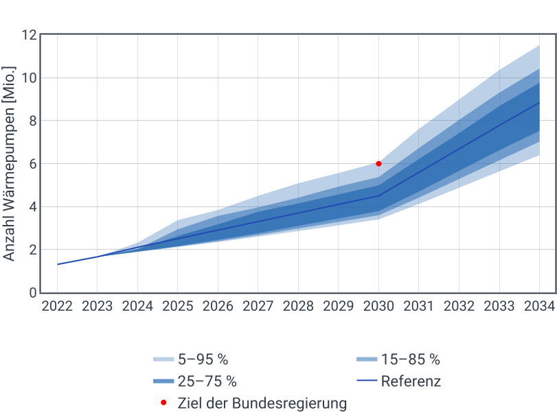 Die Unsicherheiten des Wärmepumpenausbaus werden auf Basis der Schwankung der historischen Installationszahlen abgeschätzt. Ähnlich zum Ansatz bei PV und Windkraftanlagen an Land entsteht der Unsicherheitstrichter, indem historische relative Installationszahlen bis zum Zieljahr zufällig aneinandergereiht werden.