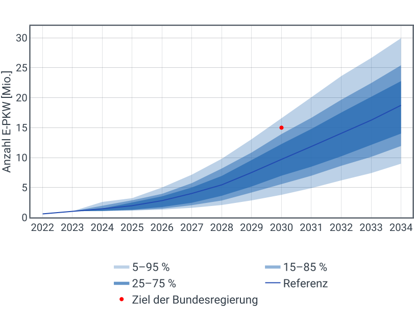 Auch zum Hochlauf der Elektromobilität führten die ÜNB begleitend zur Erstellung des NEP25 eine Studie durch. Die gemeinsam mit dem Fraunhofer Institut für Energiewirtschaft und Energiesystemtechnik (IEE) erhobene Entwicklung des Fahrzeugbestandes in Deutschland wird für das Referenzszenario herangezogen. Die Entwicklung der Elektrofahrzeuge beschleunigt sich erst ab Ende des Jahrzehntes, sodass die Ziele der Bundesregierung nicht erreicht werden.