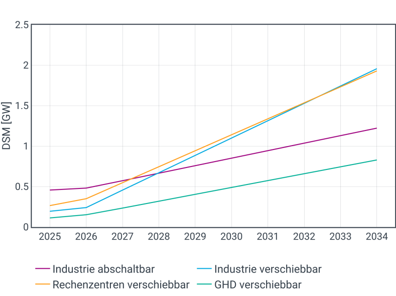 Die erschlossenen Flexibilitäten nehmen zukünftig zu. Kurzfristig werden die Kapazitäten der Bedarfsanalysen 2024 [9] angesetzt, während mittel- bis langfristig die im Szenariorahmenentwurf zum NEP25 im Szenario B [1] unterstellten Kapazitäten erreicht werden. Insgesamt steigen die Kapazitäten zur Lastreduktion von etwa 0,5 GW in 2025 auf 1,2 GW in 2034, die Kapazitäten zur Lastverschiebung von 0,6 GW in 2025 auf 4,7 GW in 2034.