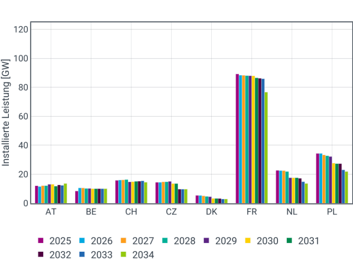 Für alle Zieljahre wird das sogenannte Standard-Hybrid-Coupling abgebildet. Dabei bilden die Gebotszonen AT, DE/LU, BE, CZ, FR, HU, NL, PL, SI und SK für alle Zieljahre die Fokusregion der lastflussbasierten Marktkopplung ab. Ab dem Zieljahr 2028 wird CH ebenfalls in diese Region aufgenommen.