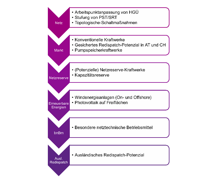 Der Einsatz netz- und marktbezogener Maßnahmen wird in einem Optimierungsschritt geschlossen ermittelt. Dabei gilt die in Abbildung 19 vereinfacht dargestellte Einsatzreihenfolge. Diese basiert auf den Annahmen der Bedarfsanalysen. Die netzseitige Versorgungssicherheit ist dann gefährdet, wenn alle engpassreduzierenden Redispatch-Potenziale und netzbezogenen Maßnahmen ausgeschöpft sind, aber dennoch unzulässige Überlastungen bestehen bleiben.