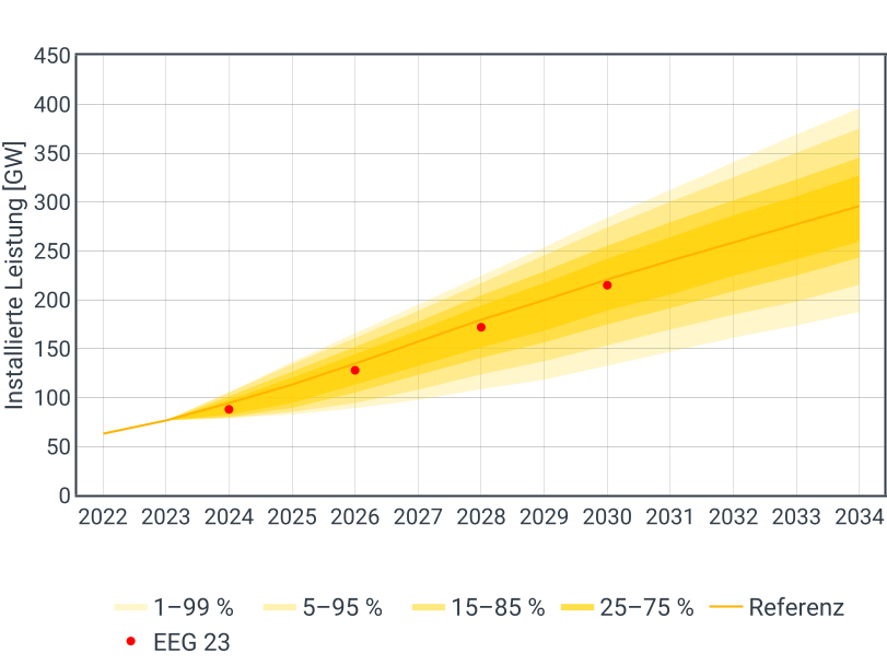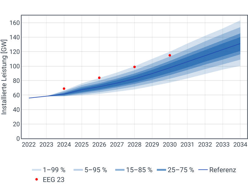 Im Referenzszenario basieren die installierten PV-Leistungen auf dem oberen Szenario der EEG-Mittelfristprognose 2024-2028 [2] der vier deutschen Übertragungsnetzbetreiber (ÜNB). Ab 2029 werden die jährlichen Zubauraten angenommen, die sich aus den Zielen des EEG23 ergeben. Damit wird die installierte Leistung ausgehend von 2028 weiter fortgeschrieben. Insgesamt werden im Referenzszenario aufgrund des aktuell hohen Zubaus die kurzfristigen Ausbauziele des EEGs übertroffen und liegen auch langfristig leicht über den Ausbauzielen.