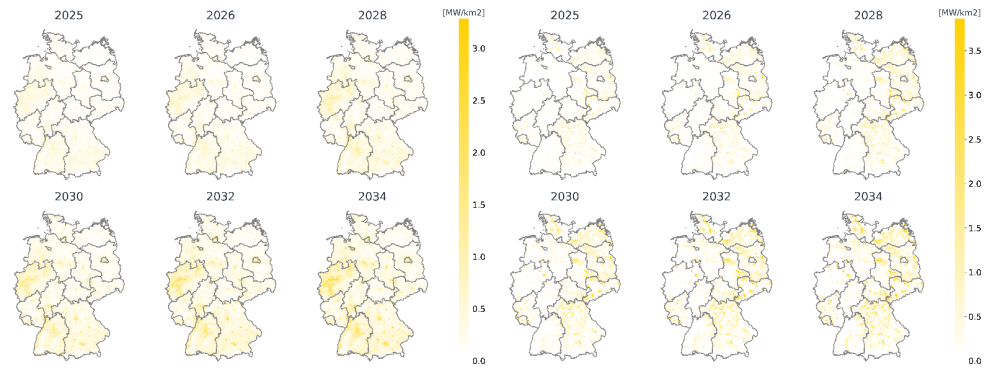 Die Referenzregionalisierung erfolgt zweistufig. Überregional orientiert sich der Ausbau je Bundesland an der EEG-Mittelfristprognose [2] sowie langfristig am Szenariorahmenentwurf zum NEP25 [1]. Innerhalb der Bundesländer konzentrieren sich auf Dächern installierte PV-Anlagen in den Ballungszentren, während PV-Anlagen auf freien Flächen überwiegend in benachteiligten landwirtschaftlichen Gebieten installiert werden. Zur Abbildung von Unsicherheiten werden der Regionalisierung stochastische Schwankungen überlagert.
