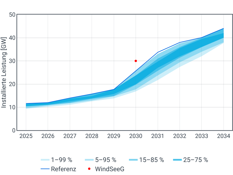 Im Gegensatz zur dezentralen Windenergie an Land sind Windkraftanlagen zur See in großen Windparks gebündelt. Die Standorte und die geplanten Inbetriebnahmedaten der Parks sowie ihrer Netzanschlüsse sind im betrachteten Zeithorizont bereits bekannt. Im Referenzszenario werden die Inbetriebnahmen eingehalten. Das im WindSeeG [4] für 2030 formulierte Ziel von mindestens 30 GW installierter und angeschlossener Windkraftleistung zur See wird somit im Jahr 2031 erreicht.