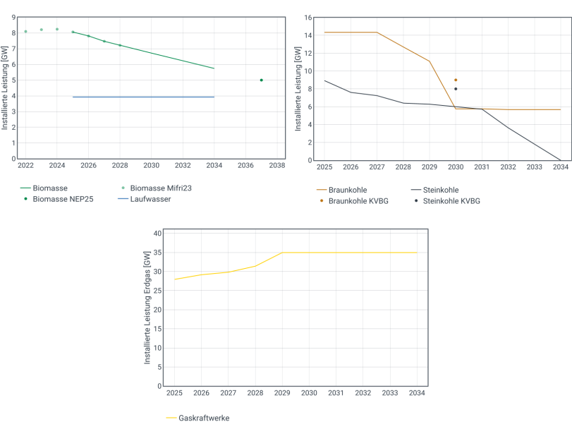 Abb. 8: Zeitliche Entwicklung installierter Kraftwerksleistungen verschiedener Energieträger. Oben links: Biomasse- und Laufwasser, Oben rechts: Braun- und Steinkohle, Unten: Erdgas.