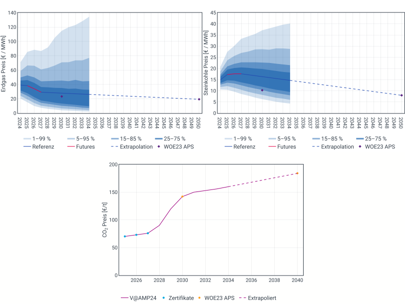 Für den Kraftwerksdispatch spielen die Brennstoff- und CO2-Preise eine entscheidende Rolle. Die Preisentwicklungen im Referenzszenario basieren bis 2027 auf aktuellen Future-Preisen, während sich die langfristige Entwicklung am World Energy Outlook 2023 [6] orientiert.